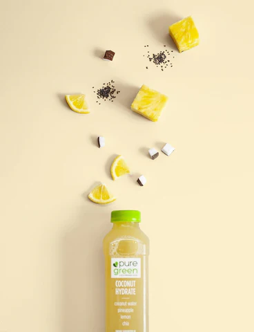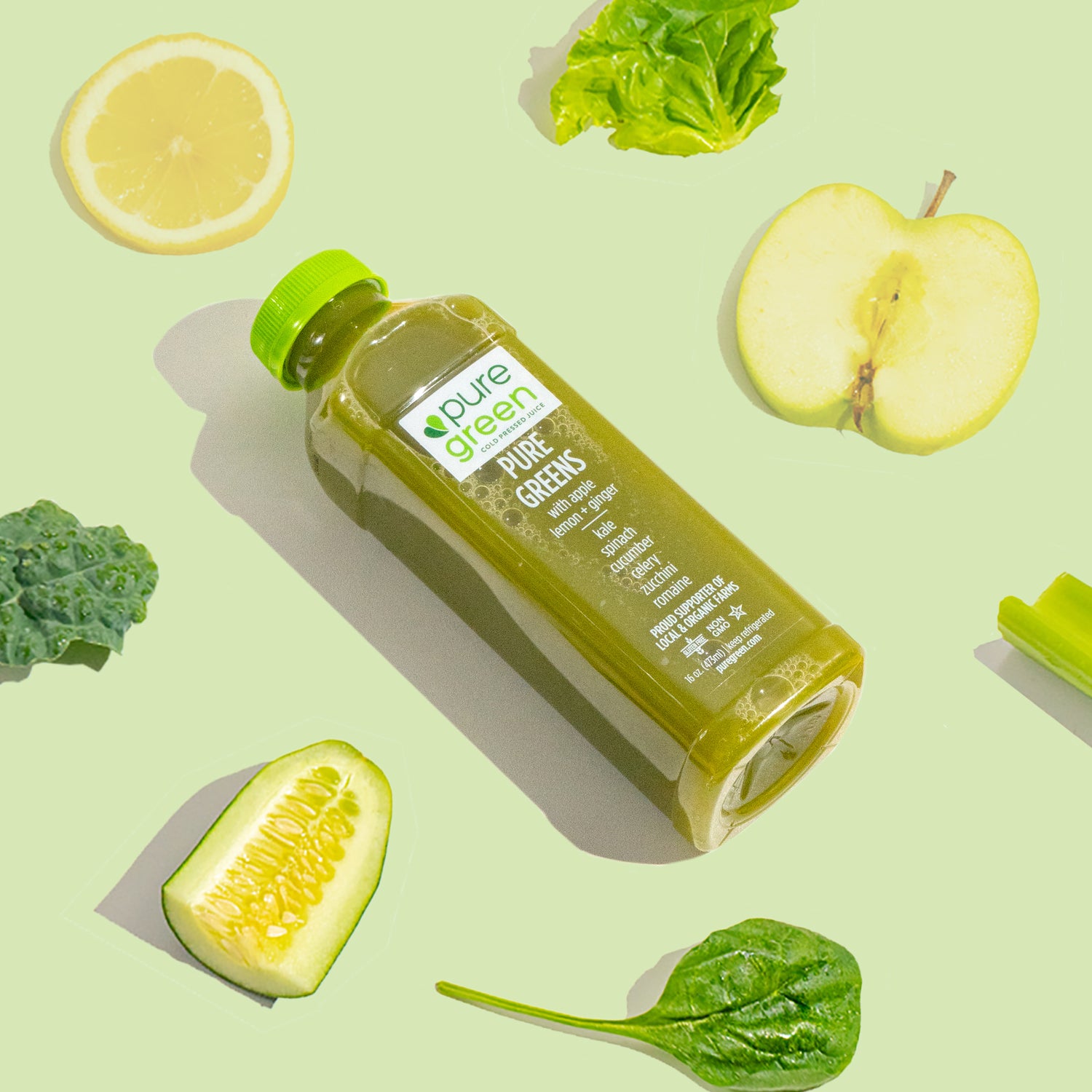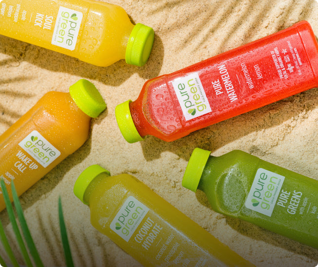 The Pure Greens with Lemon and Ginger is one of the lowest sugar cold pressed juices Pure Green offers. It is mainly our green vegetable blend of kale, spinach, cucumber, celery, zucchini and romaine with a touch of lemon and ginger for a clean and balanced flavor profile.